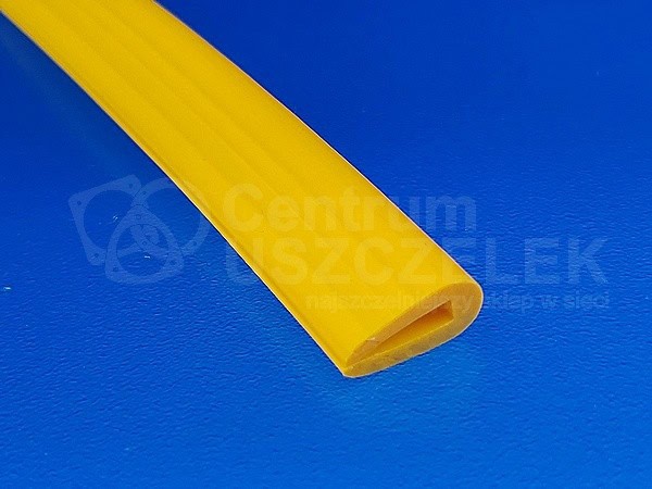 Żółta uszczelka PVC do zabezpieczania krawędzi ostrych o max grubości 3 mm, wciskana, cena za mb. Ta osłona krawędzi wykonana została z plastycznego PVC charakteryzującego się wysoką elastycznością. Profil PVC nie jest zbrojony, zachodzi na krawędź około 10 mm.