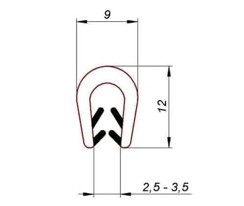 Uszczelka krawędziowa, zaciskowa EPDM , komórkowy czarny, zacisk niezbrojony EPDM czarny. Zacisk EPDM sztywny, natomiast warga miękka. Profile wpinane posiadają właściwości profili chroniących krawędzie i profili uszczelniających. Powierzchnia uszczelniająca tych profili wykonana jest z gumy piankowej, natomiast powierzchnia zacisku składa się z gumy twardej bez stalowego rdzenia do wpinania. Dwa rodzaje tworzyw są ze sobą spajane w trakcie wytłaczania podczas wulkanizacji.
