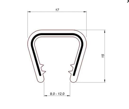 Uszczelka krawędziowa, zaciskowa, zacisk zbrojony czarny. Profile wpinane posiadają właciwości profili chroniących krawędzie i profili uszczelniających. Samozaciskowa uszczelka krawędziowa na płyty o grubości od 9 do 12 mm.
