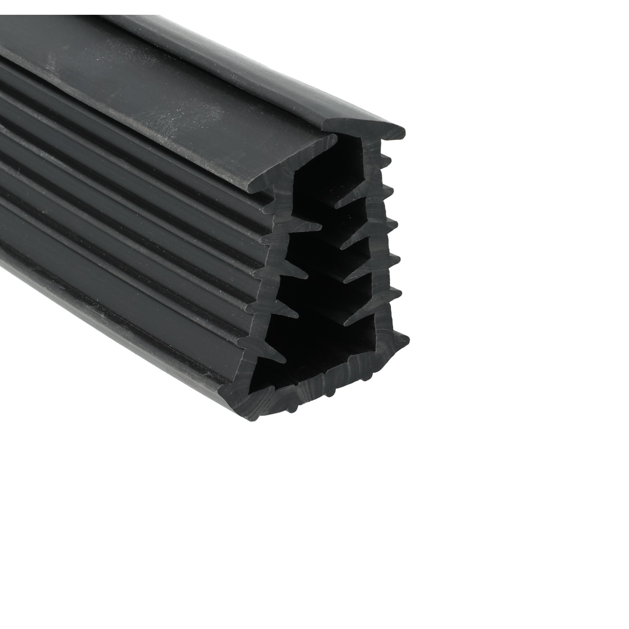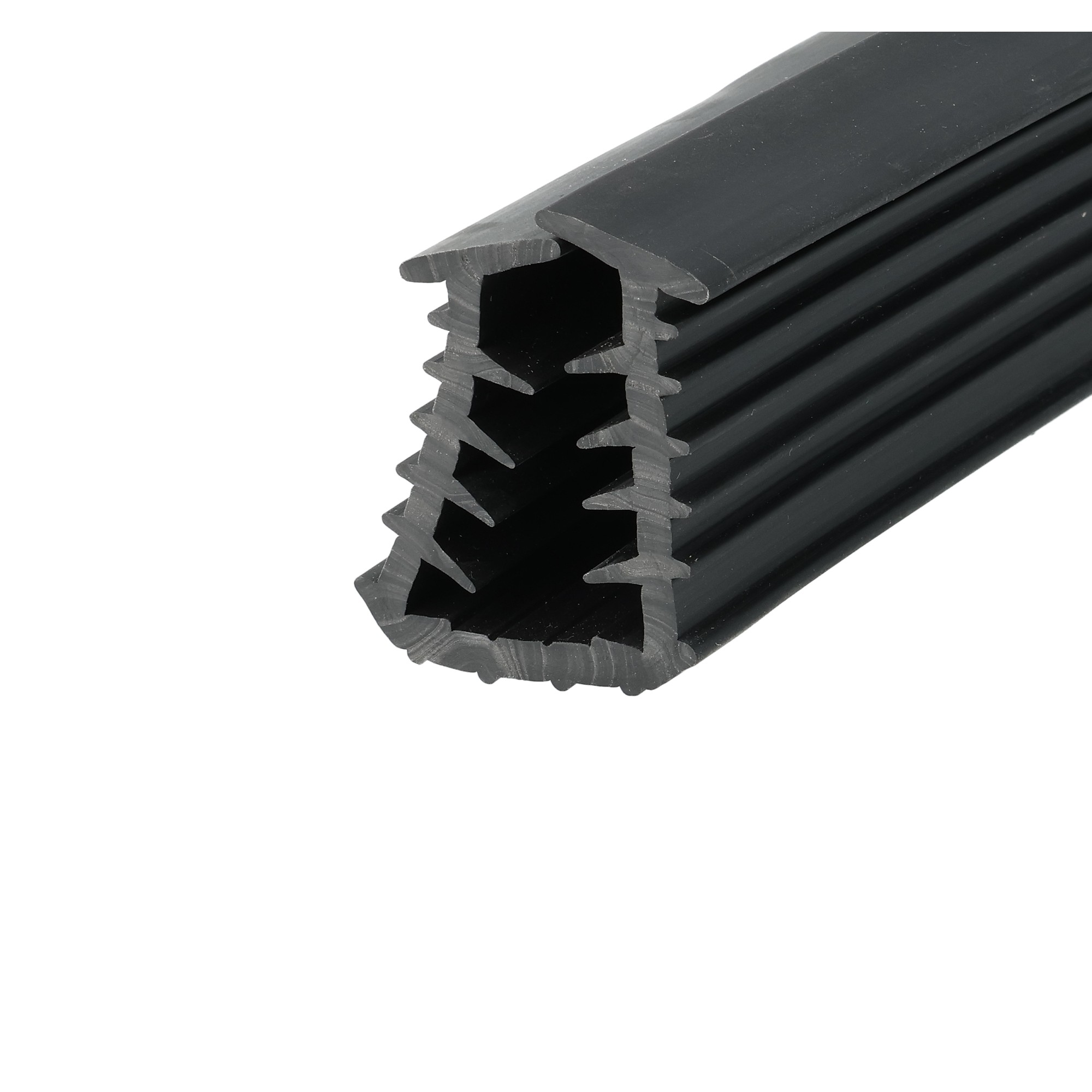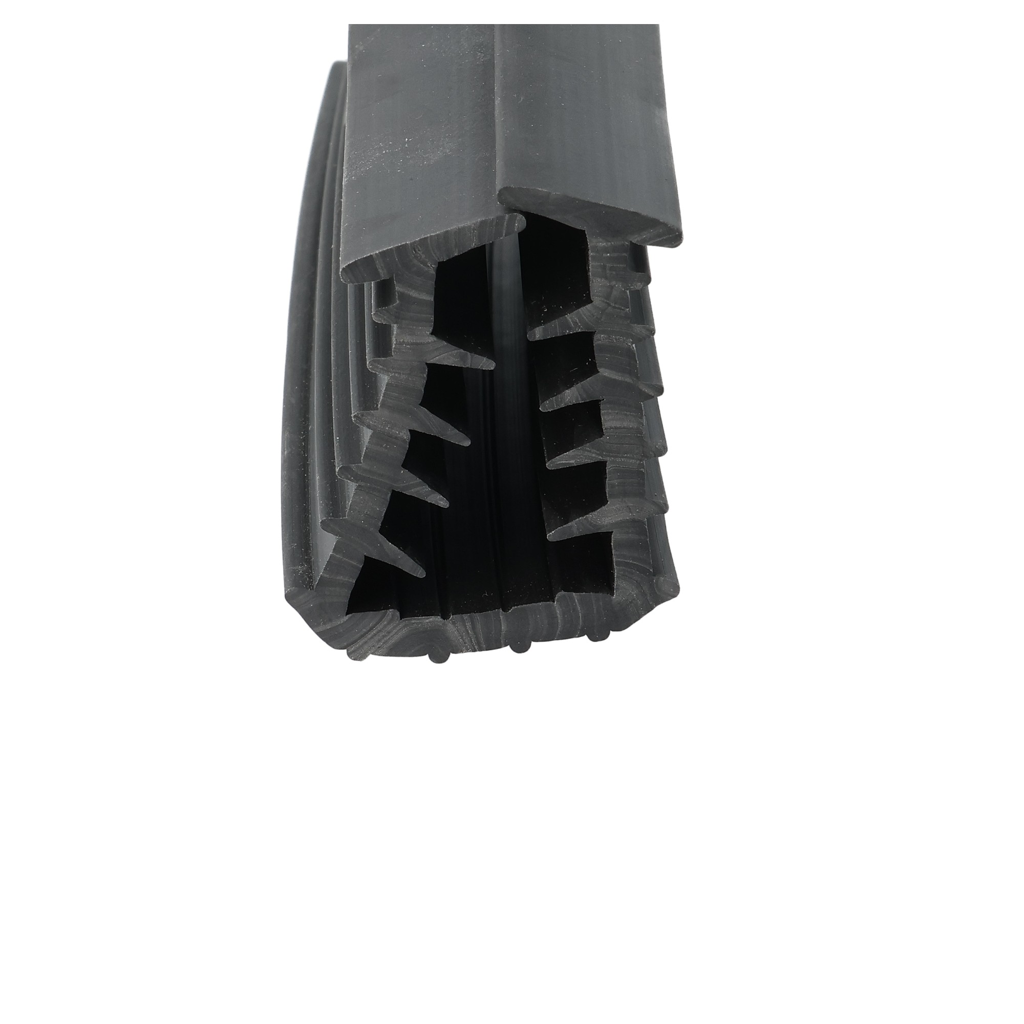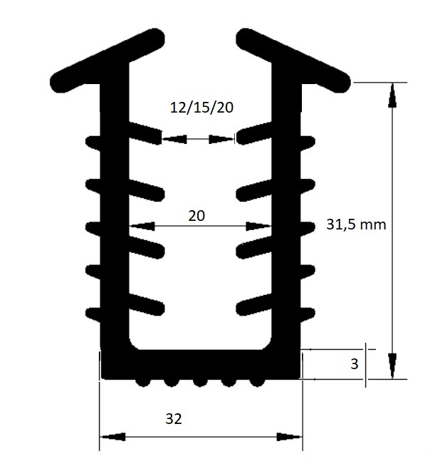 Czarna uszczelka PVC do montażu ekranów akustycznych. Profil PVC odpowiedni na krawędź o grubości 12 mm i ceownik 32 mm. Materiał czarne PVC 60° Shore.