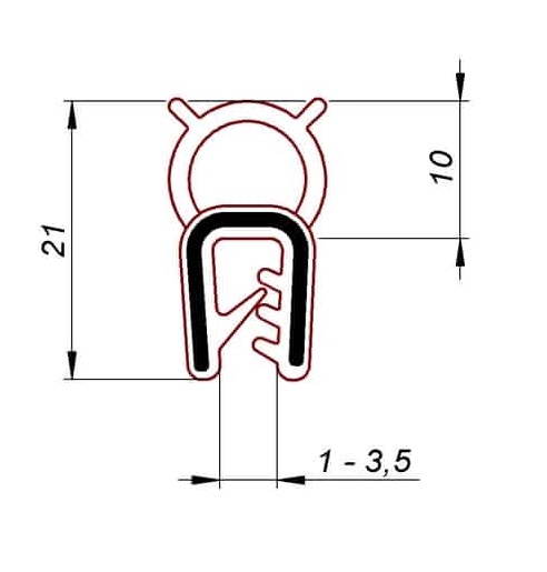Uszczelka samozaciskowa EPDM odpowiednia do krawędzi pomiędzy 1 – 3,5 mm. Materiał uszczelki krawędziowej to czarny EPDM Shore A 70° +/- 5 Shore A