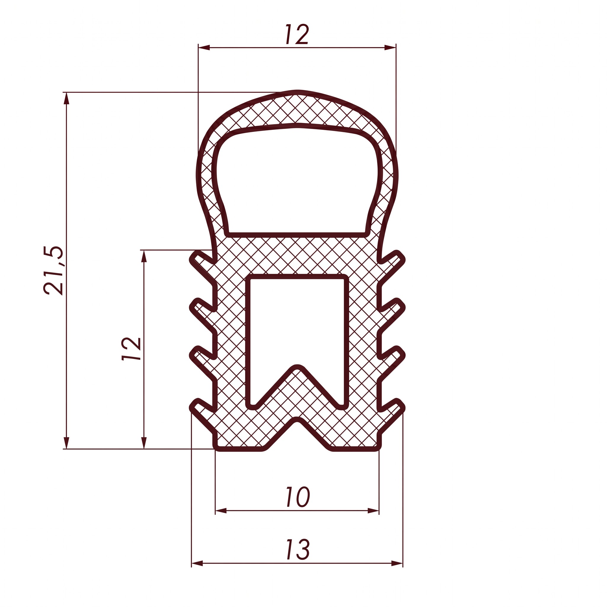 Uszczelka silikonowa profilowa kopułka 12x13x21,5mm 60°ShA ceglasta to rodzaj wysokotemperaturowego profilu uszczelniającego przeznaczony m.in. do zabezpieczania krawędzi oraz izolacji termicznej w maszynach i urządzeniach przemysłowych. Produkt ten wykonany jest z wytrzymałego elastomeru silikonowego (VMQ) i ma formę pustej kopułki z bocznymi piórami montażowymi o wymiarach podstawy 13 mm oraz wysokości całkowitej 21,5 mm.