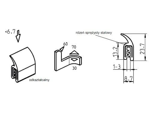 profile wpinane posiadają właściwości profili chroniących krawędzie i profili uszczelniających. część uszczelniająca profili wykonana jest z gumy epdm, natomiast powierzchnia zacisku składa się z gumy miękkiej ze stalowym rdzeniem do wpinania. dwa rodzaje tworzyw są ze sobą spajane w trakcie wytłaczania w procesie wulkanizacji.