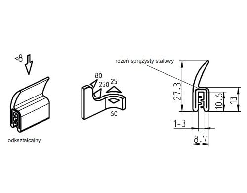 profile wpinane posiadają właściwości profili chroniących krawędzie i profili uszczelniających. część uszczelniająca profili wykonana jest z gumy epdm, natomiast powierzchnia zacisku składa się z gumy miękkiej ze stalowym rdzeniem do wpinania. dwa rodzaje tworzyw są ze sobą spajane w trakcie wytłaczania w procesie wulkanizacji.