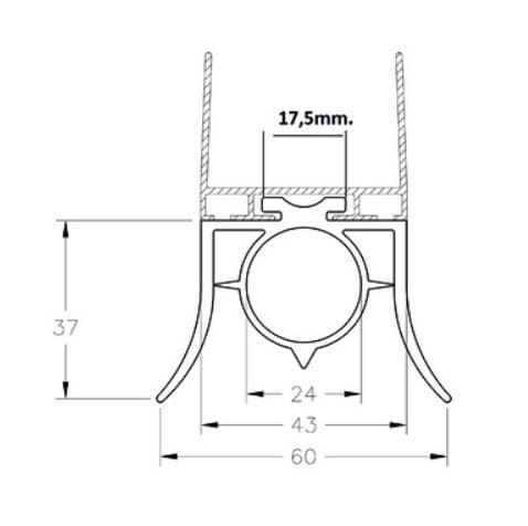 uszczelka dolna epdm dwuwargowa z wewnętrzną komorą. gumowy profil zawiera wewnętrzną okrągłą komorę o średnicy 24 mm pod korki czujnika pneumatycznego. okrągłe elementy gumy muszą być usunięte przed włożeniem w korytko aluminiowe.