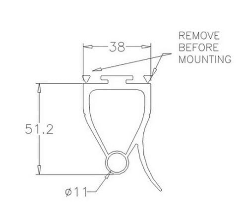 uszczelka dolna przeznaczona do montażu optosensorów. wysokość h – 52mm, wewnętrzna okrągła komora o średnicy 11mm. wysokość profilu podlega wymaganiom ce-ittr zależnymi od szybkości ruchu bramy i poziomu siły zamykania.