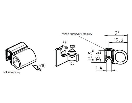 Materiał: czarna guma porowata EPDM – profil mocujący PVC Shore A 75° +/- 3 Shore A