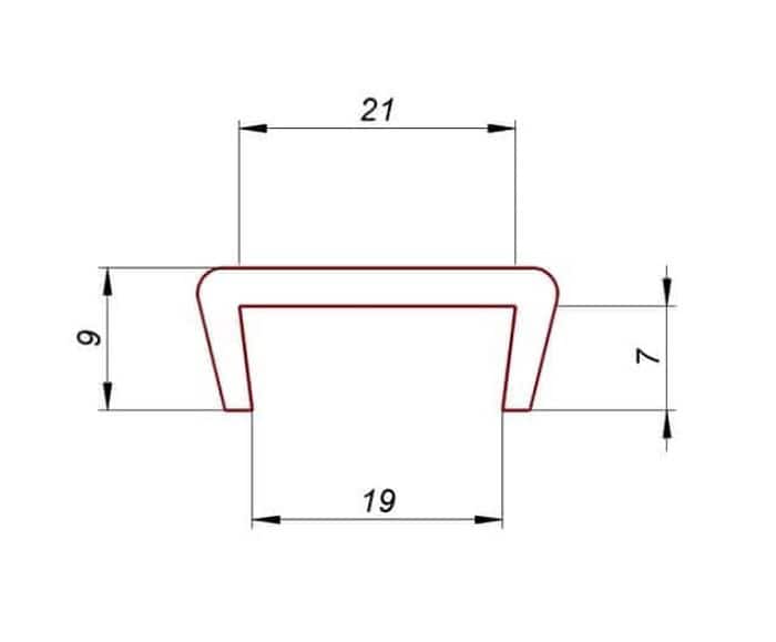 Czarna uszczelka PVC do zabezpieczania krawędzi o grubości 20 mm, wciskana. Ta osłona krawędzi wykonana została z plastycznego PVC. Profil PVC nie jest zbrojony, zachodzi na krawędź około 7 mm, grubość ścianek 2 mm.