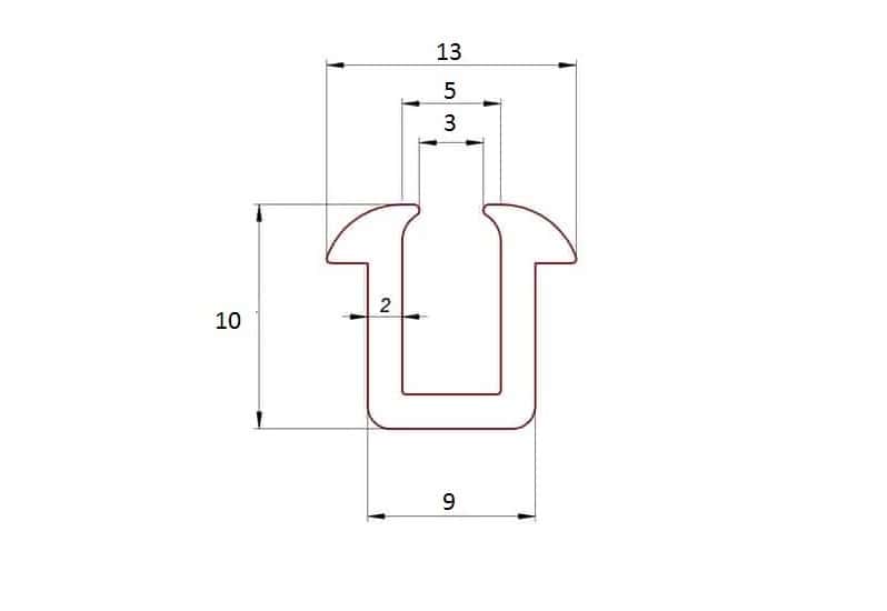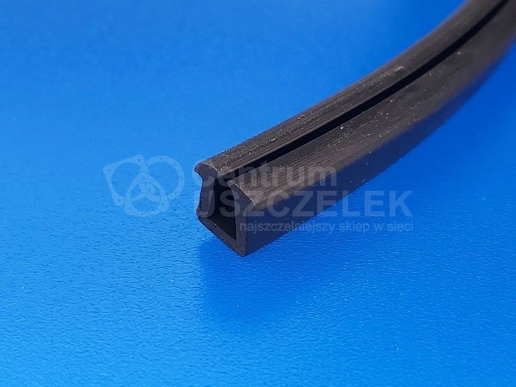Czarna uszczelka EPDM do zabezpieczania krawędzi ostrych  max grubości 3-5 mm, wciskana.  Profil gumowy nie jest zbrojony, zachodzi na krawędź około 8 mm. Materiał czarne  EPDM 70° Shore.