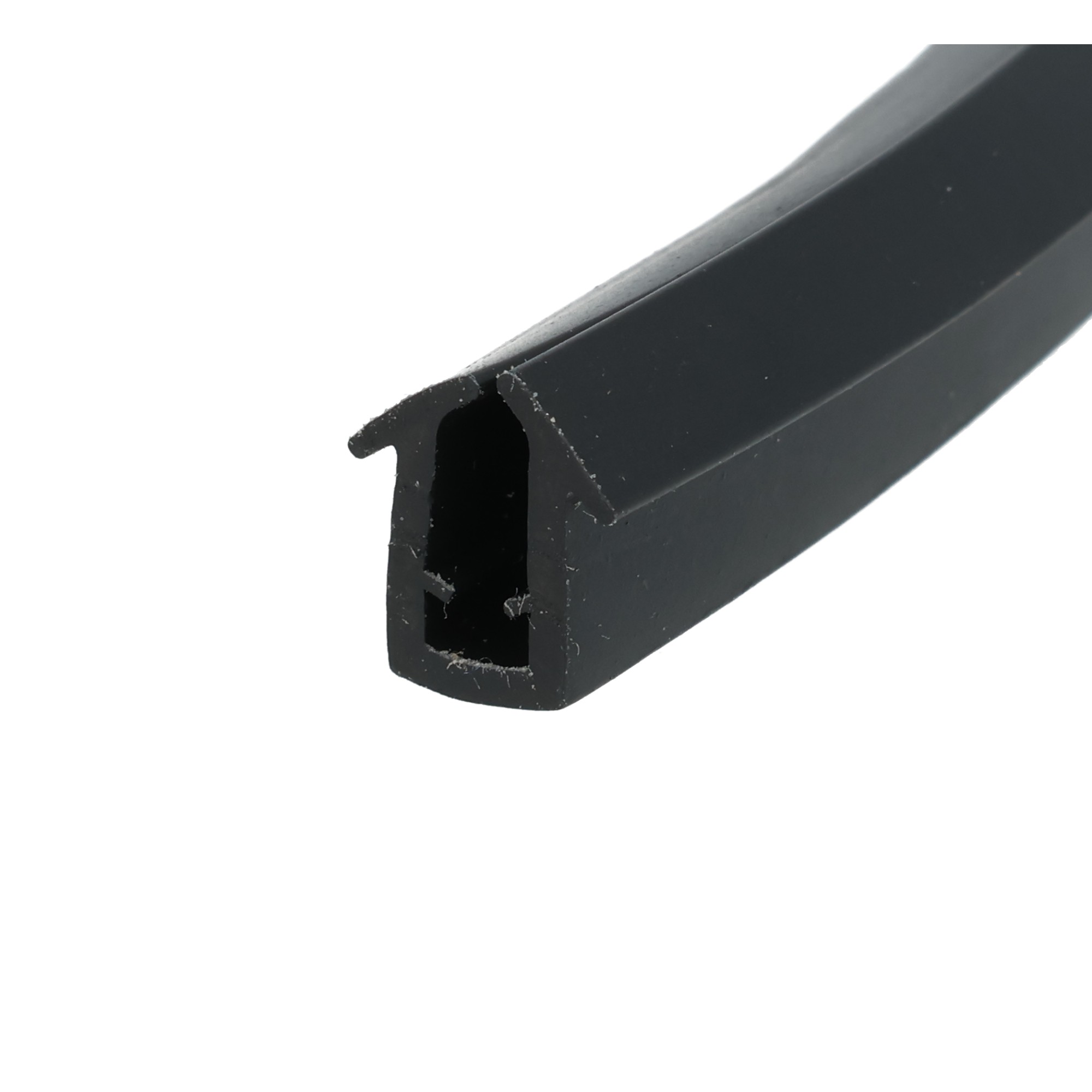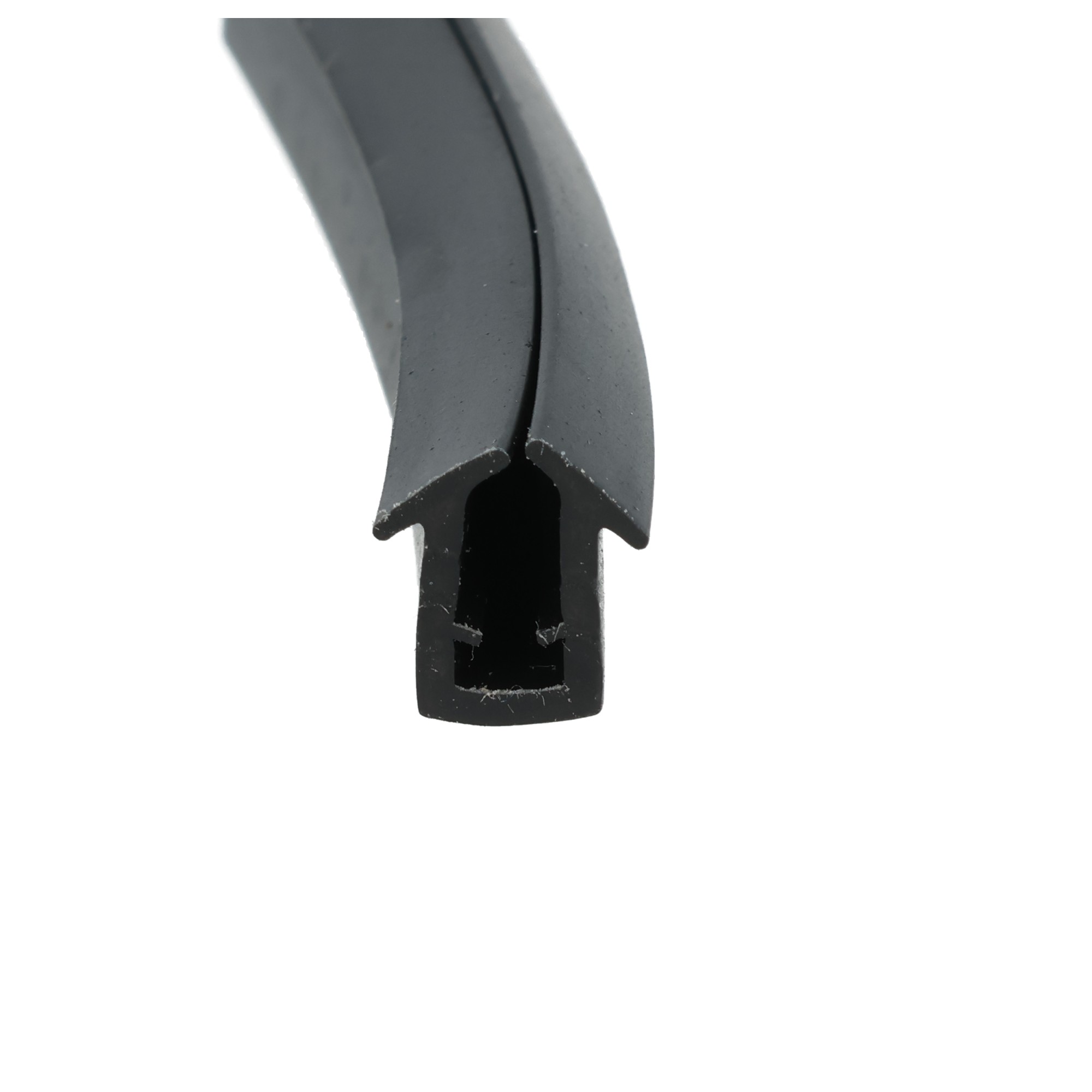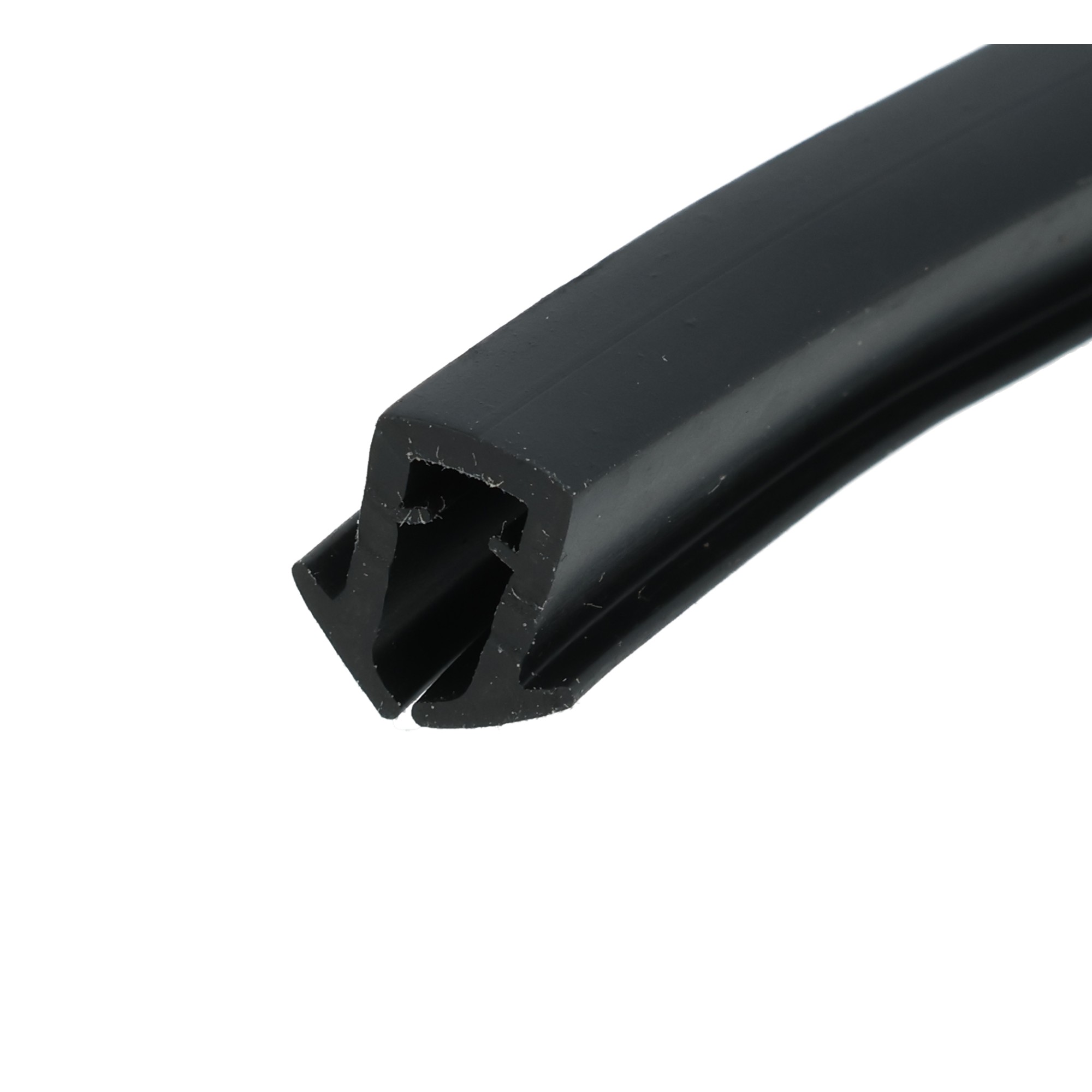 Czarna uszczelka z litej gumy EPDM do zabezpieczania płyt poliwęglanowych, szyb max grubości 4,5 mm, wciskana. Materiał czarna, elastyczna guma EPDM, twardość 60 Sha.