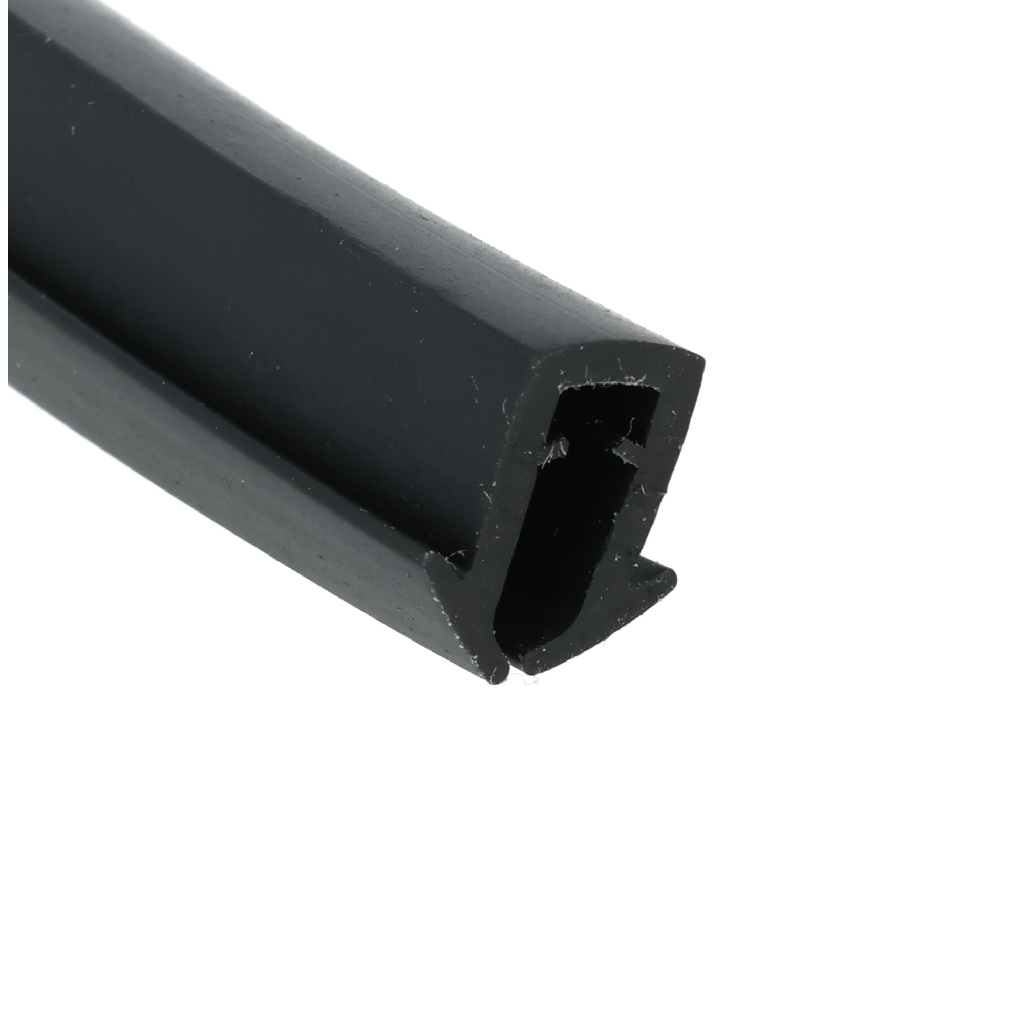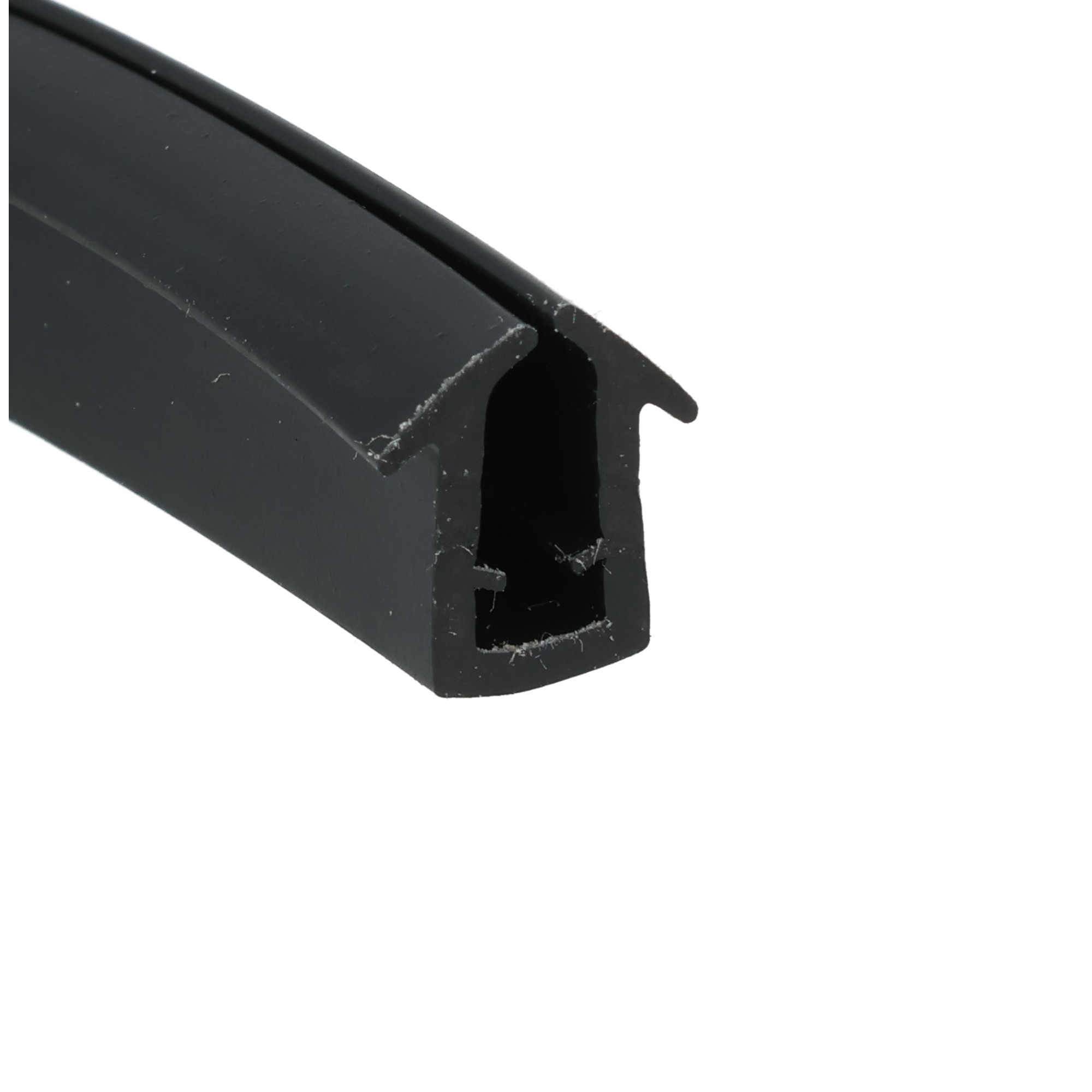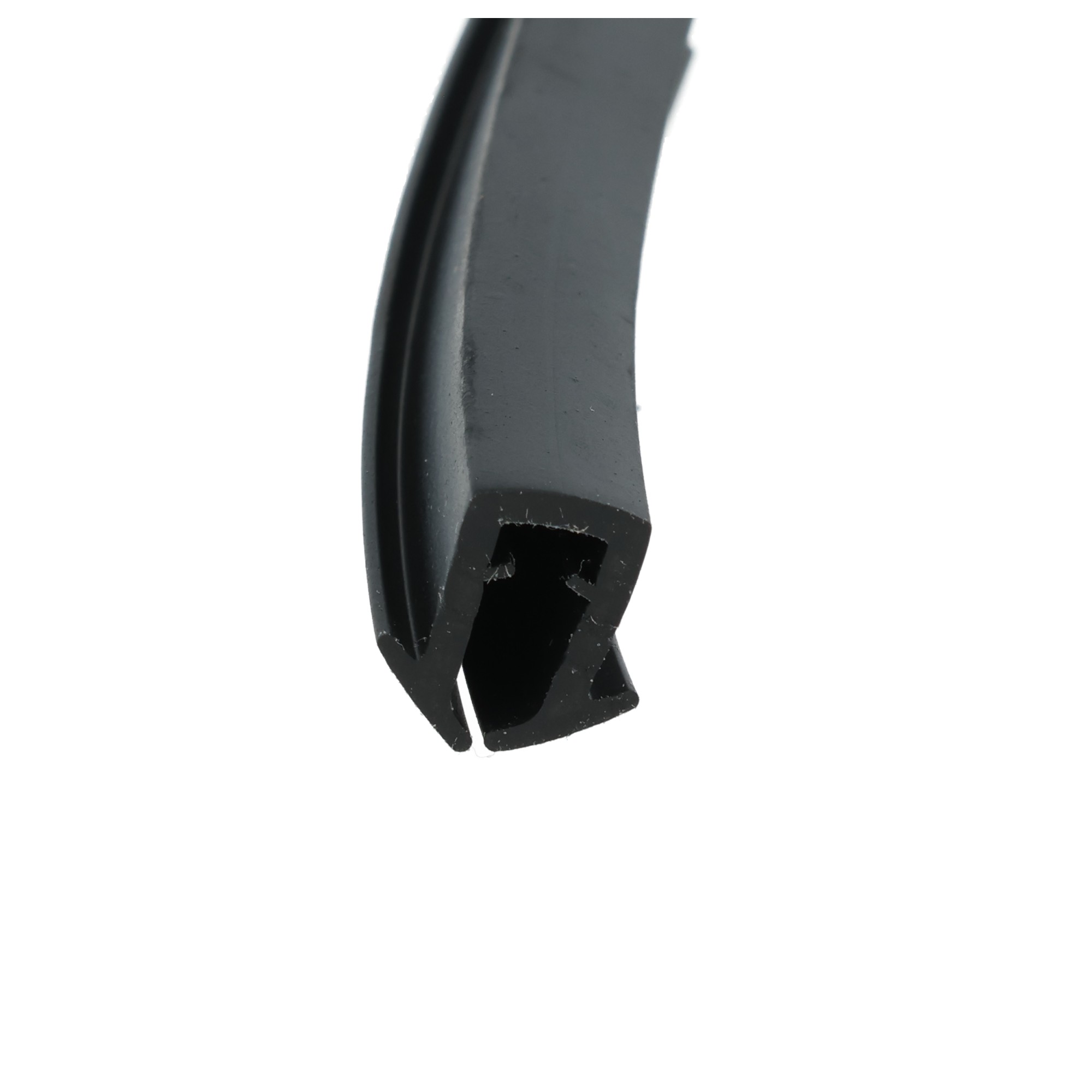 Czarna uszczelka z litej gumy EPDM do zabezpieczania płyt poliwęglanowych, szyb max grubości 4,5 mm, wciskana. Materiał czarna, elastyczna guma EPDM, twardość 60 Sha.