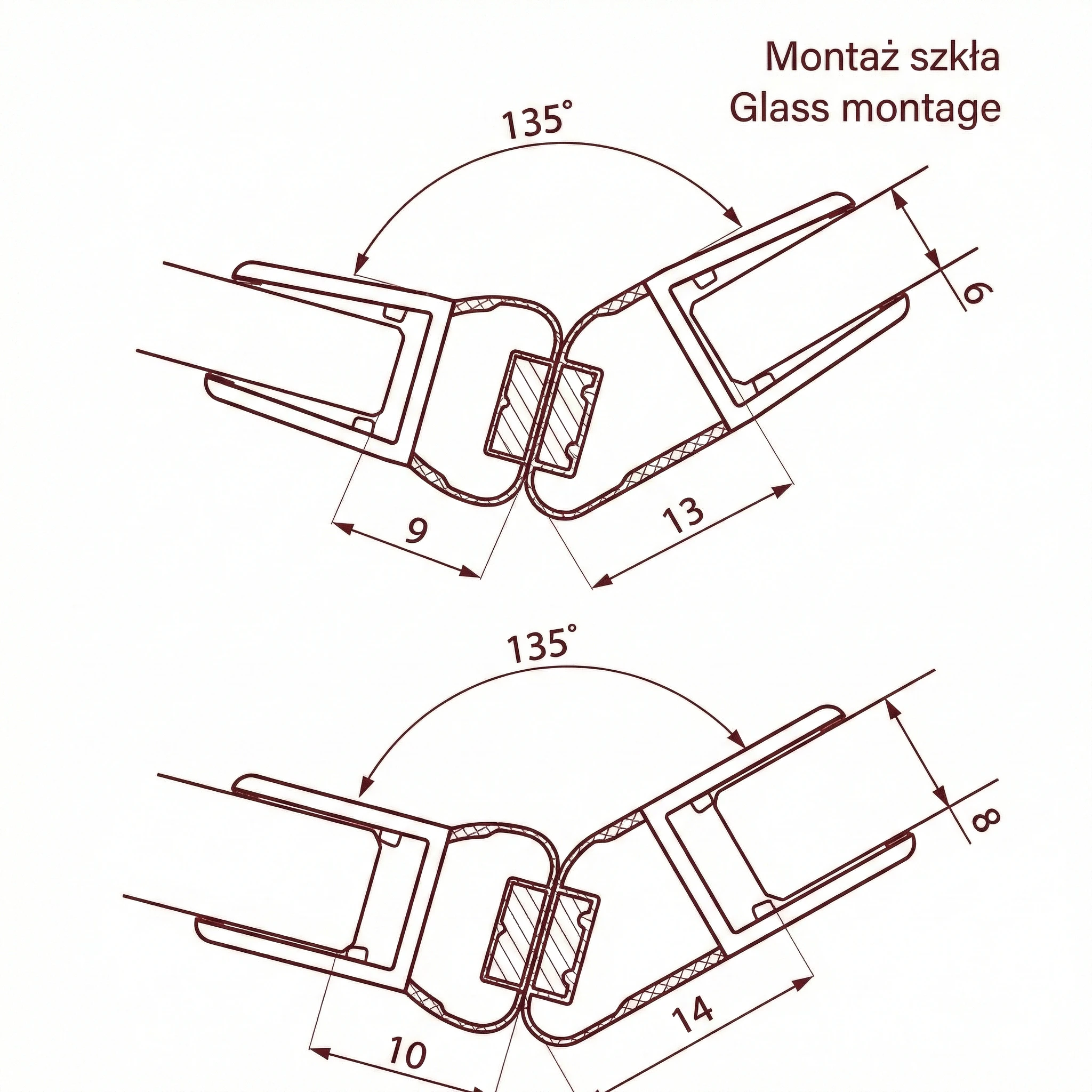 Montaż uszczelki jest intuicyjny i nie wymaga użycia kleju. Wystarczy nasunąć profil na krawędź szyby. Dzięki precyzyjnym wymiarom podanym na schemacie (9-13 mm dla szkła 6 mm oraz 10-14 mm dla szkła 8 mm), uszczelka stabilnie trzyma się powierzchni szkła.