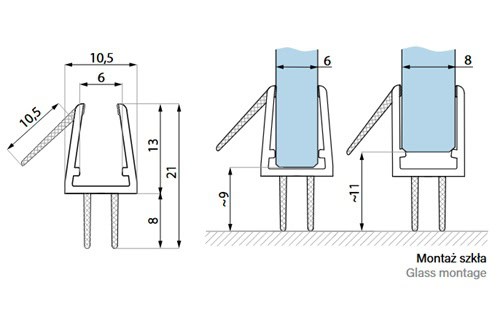 Uszczelka drzwi kabiny prysznicowej z okapnikiem. Uszczelka drzwi kabin prysznicowych o grubości szkła 6 + 8 mm.