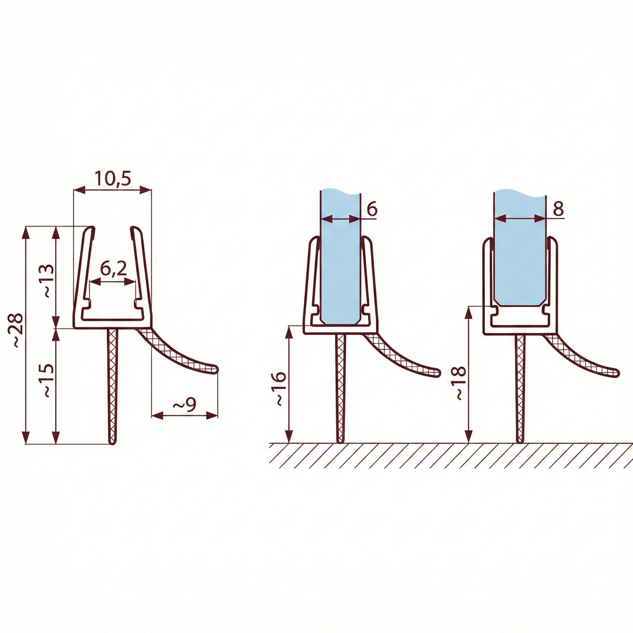 Dzięki unikalnej konstrukcji, uszczelka jest kompatybilna z szybami o grubości 6 mm oraz 8 mm. Specjalne wypustki wewnątrz profilu dopasowują się do szkła, gwarantując stabilność i szczelność bez konieczności użycia kleju.
